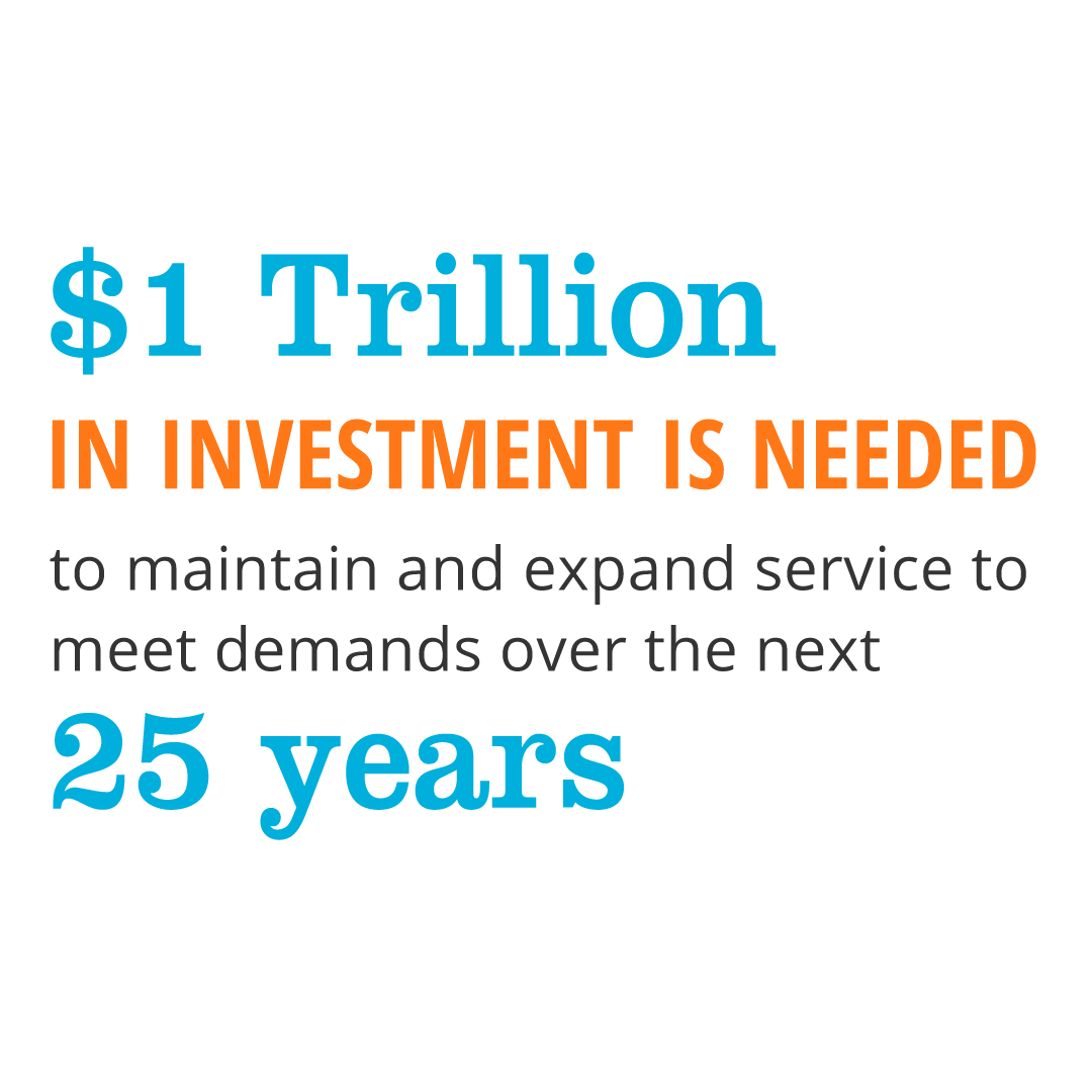 Conditions & CapacityWhile drinking water infrastructure is funded primarily through a rate-based system, the investment has been inadequate for decades and will continue to be underfunded without significant changes as the revenue generated will fall short as needs grow. According to the American Water Works Association, upgrading existing water systems and meeting the drinking water infrastructure needs of a growing population will require at least $1 trillion.